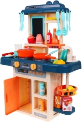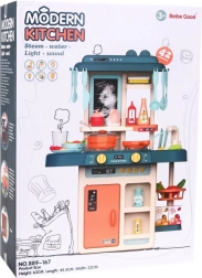 Onderdeel is een functionele gootsteen met kraan die je met water kunt vullen, een te openen koelkast, praktische plankjes en een krijtbord boven de kookplaat waar kinderen hun recepten of lijstjes kunnen schrijven. De complete set bevat 42 onderdelen, waaronder servies, etenswaren en keukenaccessoires. Het speelgoed werkt op 3× AA-batterijen (niet inbegrepen) en heeft CE-certificering.
