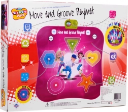 De mat is uitgerust met 5 grote verlichte velden, een SELECT-knop om het muziekschema te wijzigen (5 muziekschema's), knoppen voor het instellen van het muziektempo (+/-), een START-knop om de muzikale uitdaging te beginnen en een groot geluidscontrolepaneel met kleurrijke projector, luidspreker en een volumeregeling en aan/uit-knop (ON/OFF). De mat schakelt automatisch uit na 2 minuten inactiviteit. Het is mogelijk om een telefoon aan te sluiten via een kabel.