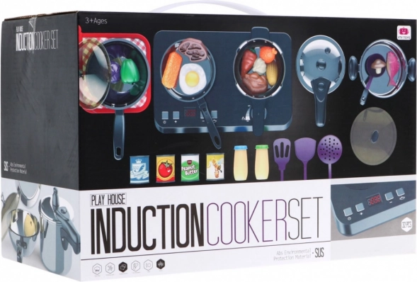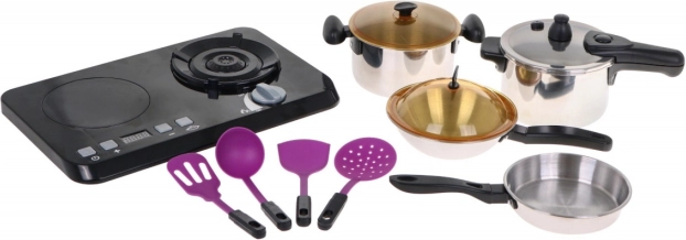 Geweldige, uitstekend uitgeruste keukenset bestaande uit een inductiekookplaat, pannen en kookaccessoires, bedoeld voor kinderen vanaf drie jaar. De koekenpan, pan en snelkookpan zien eruit als echte, maar dan in miniatuur. De inductiekookplaat werkt op 3 AA 1,5 V batterijen (niet inbegrepen) en is voorzien van geluid- en lichteffecten. Links bevindt zich een verlichte brander met kookgeluiden en een paneel om de kooktijd in te stellen van 2 tot 20 minuten. Rechts is er een verlichte brander met bakgeluiden en een aan/uit-knop. Het pakket bevat ook imitatie-voedingsmiddelen.