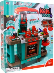 De set bevat een keuken met gootsteen, oven, plankjes en kookplaat, samen met alle accessoires zoals servies, keukengerei, fruit, groenten en meer. Deze keukenset werkt op drie AA-batterijen (niet inbegrepen).