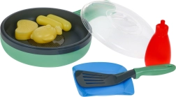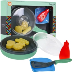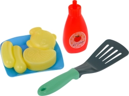 De set bevat een pan met deksel, spatel, bord, ketchup, vis, biefstuk en worstjes voor een complete speelervaring.