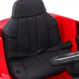 Een zitje van zwart eco-leer met veiligheidsgordels, te openen deuren met vergrendeling en LED-verlichting voor en achter zorgen voor een realistische en comfortabele rijervaring.