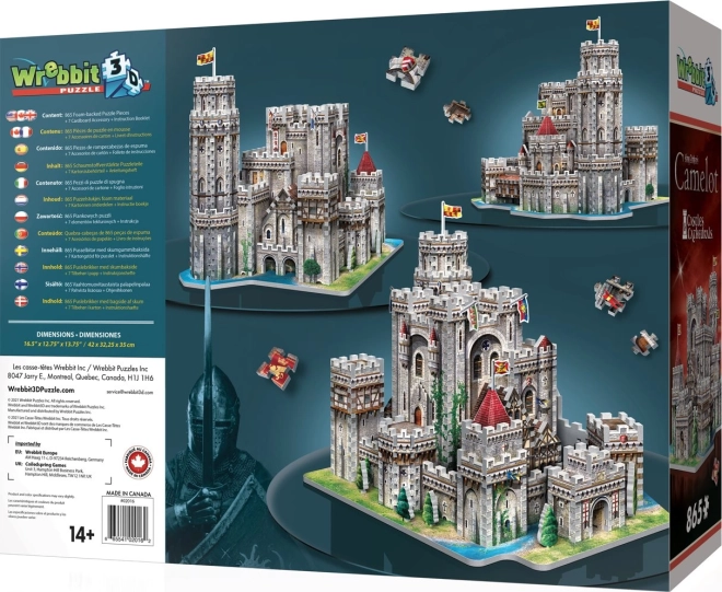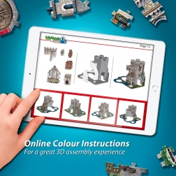Maak thuis een indrukwekkend model van kasteel Camelot met torens, kantelen en vlaggen. Dankzij het speciale materiaal en de nauwkeurige vormgeving van de stukjes blijft het model stevig zonder lijm of gereedschap. De montage verloopt aan de hand van duidelijke referentieafbeeldingen en een zwart-witte geïllustreerde handleiding.