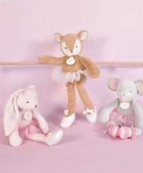 Deze zeer zachte pluchen muis is gekleed in een ballerina-outfit met een tule tuturok en satijnen ballerina’s, versierd met een fluwelen strik. Ze biedt kinderen een mix van zachte en trendy kleurharmonieën die zowel kleintjes als grotere kinderen aanspreken. Ideaal voor thuis spelen en voor wandelingen.