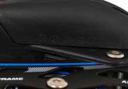 Veters, een klittenbandriem en een gesp met vergrendeling houden de voet stevig op zijn plaats. De rem op de rechterskate helpt gecontroleerd te stoppen.