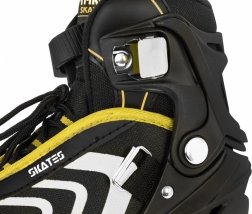 De schoen is voorzien van effectieve ventilatie, een semipermeabel membraan en een voorgevormde inlegzool met zacht EVA‑schuim afgewerkt met fluweelzacht Velvet‑materiaal. Het driedubbele sluitsysteem (vetering, klittenbandriem, gesp met vergrendeling) houdt de voet stabiel. Het aluminium frame met PU wielen 70×24 mm, hardheid 85A en ABEC‑7 lagers biedt een vloeiende en snelle rit; de rechter skate is uitgerust met een rem.