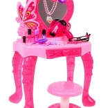 Schattige roze kaptafel voor kleine stijliconen met licht- en geluidseffecten, een interactieve föhn met luchtstroom en een rijke set accessoires voor creatief spel. Inclusief een openbaar laatje voor schatten, een stabiele tafel met spiegel en een comfortabele kruk. Ideaal voor kinderen vanaf 3 jaar, met nadruk op fantasie, rollenspel en fijne motoriek.