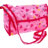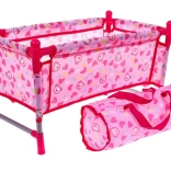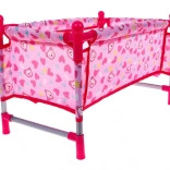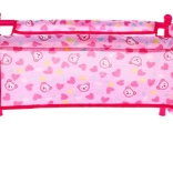 Het voor poppen ontworpen bedje is ideaal voor rollenspel rond de verzorging van een baby. Het is gemaakt van roze stof met hartjes- en beertjesmotief, wat elk kind zal aanspreken.
