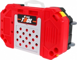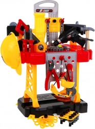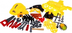De set is rijk uitgerust: accuboormachine/schroevendraaier, hamer, bankschroef, zaag, tang, inbussleutels en steeksleutels, schroevendraaiers, schroeven, moeren, tandwielen, meetlint en werkstukken met schroefdraad voor eindeloos schroeven en monteren. Dankzij de slim ontworpen organisatie van het gereedschap oefenen kinderen orde, geduld en oog-handcoördinatie.