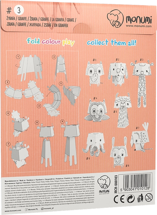 Ontdek een leuke 3D-kleurpuzzel met een dier met een grote kop, die kinderen zelf kunnen inkleuren en in elkaar zetten zonder lijm of schaar. Gemaakt van hoogwaardig wit karton met professionele be... Meer tonen