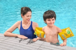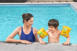 Dankzij de compacte afmetingen passen de zwemvleugels gemakkelijk in de tas voor het zwembad of op vakantie. Het veiligheidsventiel voorkomt ongewenst luchtverlies en de felle gele kleur met vismotief vergroot de zichtbaarheid van het kind in het water.