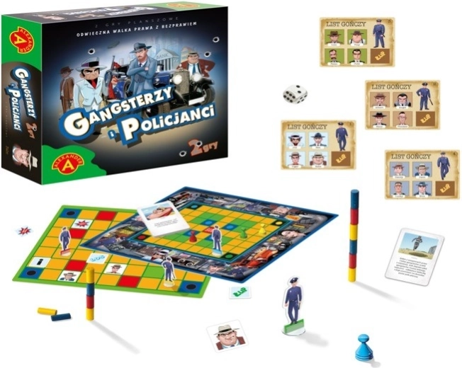 Betreed de wereld van maffia-intriges en politieachtervolgingen met het spel Gangsters en agenten van ALEXANDER. Twee spelmodi bieden verschillende strategieën en emoties: als onverschrokken agenten vang je criminelen en win je de buit terug, als gevaarlijke gangsters beroof je de bank en schakel je de concurrentie uit. Spel voor 2–4 spelers, vanaf 8 jaar, met elementen van geheugen en strategie.
