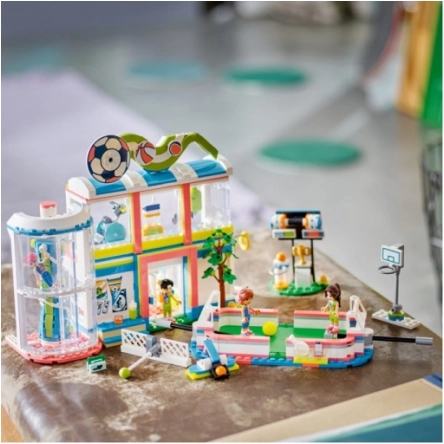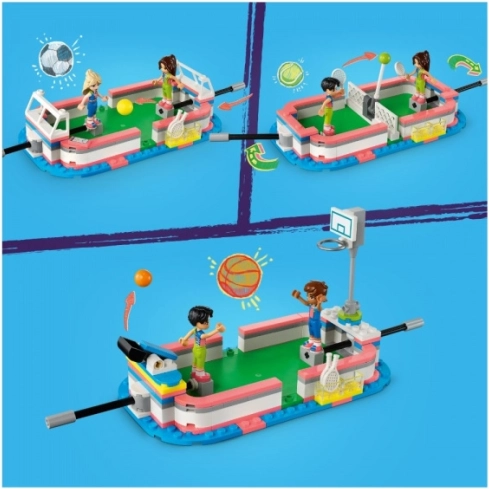 Het LEGO Friends Sportcentrum biedt kinderen eindeloze speelmogelijkheden. Het modulaire speelveld verander je eenvoudig van voetbal naar tennis of basketbal, met een scorebord, veilige ballenopslag en een gedetailleerde backstage – fitnessruimte, klimmuur en kleedkamer. Met de LEGO Builder app is bouwen intuïtief dankzij in- en uitzoomen, het model draaien en voortgang bijhouden.