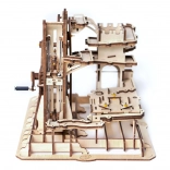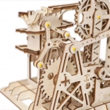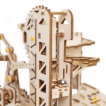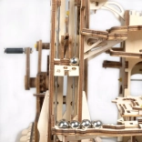 Het model bevat een torenverdeler, spiraalhellingen, kraan- en wiellift, een korte glijbaan en slim geplaatste schakelaars die de route van de knikkers veranderen. De moeilijkheidsgraad is 4/5; montage duurt ongeveer 6–7 uur. Na voltooiing hoef je alleen aan de hendel te draaien en je mee te laten voeren door het dynamische schouwspel dat de principes van STEM tastbaar maakt.