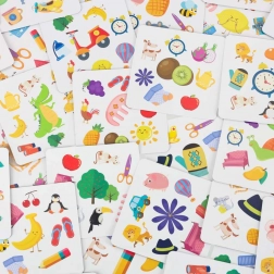 - Hoe te spelen (voorbeeld): Elke speler neemt één kaart, leg de stapel op tafel. Draai de bovenste kaart van de stapel om en zoek het gemeenschappelijke plaatje met jouw kaart. Wie het eerst vindt, rinkelt en neemt de kaart op zijn/haar stapel. Ga door tot de stapel op is.