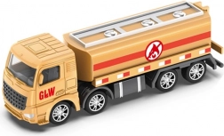 Beige tankwagen met cilindervormige tank, rode strepen en logo biedt soepel rijgedrag dankzij vrij draaiende wielen. Ideaal om vloeistoftransport na te spelen en de “verkeerswereld” van kinderen uit te breiden.