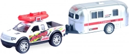 SUV met trekhaak en kampeeraanhanger, vrij draaiende wielen en fraaie prints voor een authentieke ervaring.