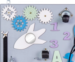 - Rijke uitrusting: kleurrijke tandwielen, rits, bel, twee soorten grendels/schuifsloten, schoen met veter om strikken te oefenen, houten cijfers en letters, draaiwieltjes, klittenband, baan met schuifautootje, busvormig krijtbordje om op te schrijven, haak, onbreekbare spiegel in raketvorm, klok met beweegbare wijzers, vormenstoof met drie elementen, liniaal en lichtschakelaar.
