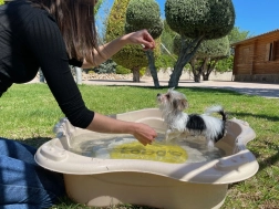 Dit ruime huisdierenzwembad is ideaal voor een hygiënisch bad en zomerse afkoeling in de tuin. De lichte maar stevige constructie met materiaal verrijkt met amandelschillen zorgt voor een langere levensduur en een kleinere ecologische voetafdruk. De water- en UV-bestendige decoratie is aangebracht met IML-technologie, waardoor deze niet afbladdert of vervaagt.