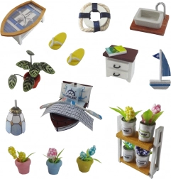 Het miniatuurhuisje bevat zorgvuldig ontworpen maritieme accessoires, zoals een bed in de vorm van een boot en andere fijn afgewerkte details. Elk onderdeel is qua kleur afgestemd om het zeethema te benadrukken en een gevoel van rust en elegantie in je interieur te brengen.