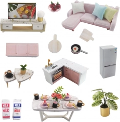Woonhoek, eetkamer, keuken en slaapkamer met miniatuurmeubels en decoraties vormen een geloofwaardig en indrukwekkend geheel.