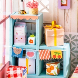 In de doos vind je lijm, verf, een penseel en kleine accessoires. Er wachten je schattige mini-decoraties – ballonnen, bloemen, meubels en etalages met opschriften.