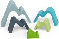 Vijf gevormde stukken in de vorm van bergen kunnen eindeloos worden gestapeld, genest en gecombineerd. Zo ontwikkelen kinderen hun fantasie en fijne motoriek.
