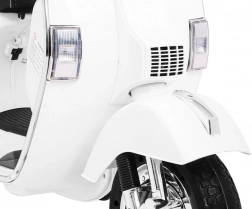 Elektrische kinderscooter Vespa in elegant wit is de ideale metgezel voor jonge rijders die verlangen naar stijlvol en veilig rijden met zijwieltjes en een vloeiende start.