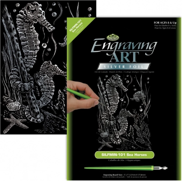 De werkwijze is eenvoudig: neem de kraspen en volg de lijnen op de voorbedrukte afbeelding. Je kunt ook je eigen accenten toevoegen en zwarte, onbedrukte plekken wegkrassen, waardoor je het werk een eigen omlijsting geeft.
