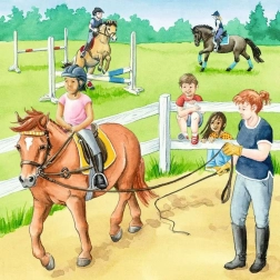 Kinderen leggen meteen drie verschillende scènes – paardrijden met begeleiding, een rustige weide en de verzorging van paarden in de stal. Elk motief brengt een nieuwe uitdaging en plezier bij het puzzelen.