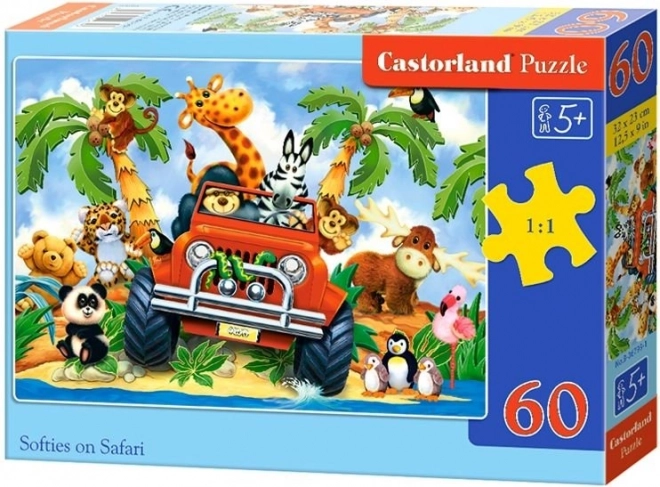 Kleurige kinderpuzzel met het thema Softies on Safari met 60 stukjes voor leuk puzzelplezier en vaardigheidsontwikkeling. Na het leggen ontstaat een afbeelding van 32 × 23 cm. Kwalitatieve afwerking, heldere kleuren en prettig grote stukjes ondersteunen concentratie, geduld en plezier in puzzelen.