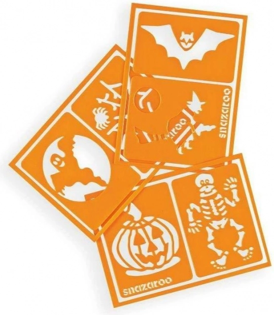 Set van zes SNAZAROO-sjablonen voor eenvoudig en snel schminken van gezicht en lichaam. Thema-motieven voor Halloween, zelfklevende achterkant voor stabiliteit, flexibel materiaal voor aansluiting op rondingen en herbruikbaar dankzij afwasbare uitvoering.