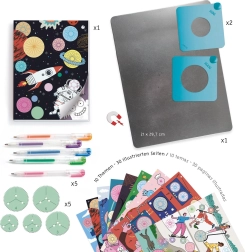 Alles wat je nodig hebt zit in de doos – van de metalen onderplaat en de tandwieltjes met drie gaten tot de gekleurde gelpennen. Kies een sjabloon, fixeer het met het magnetische kader en ga aan de slag met unieke decoratieve composities.