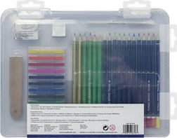 De praktische kunststof box houdt alles overzichtelijk op zijn plaats en laat u overal creëren. De set is ideaal als cadeau, voor creatief werk thuis en voor het bestuderen van beeldende technieken – van subtiel arceren met houtskool tot aquareleffecten met potloden.