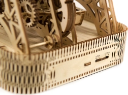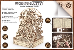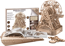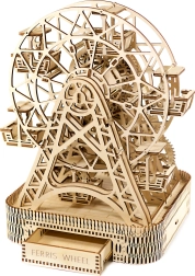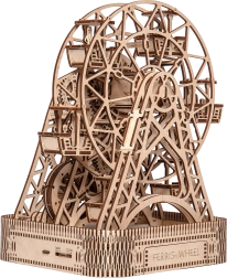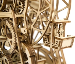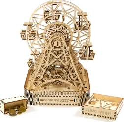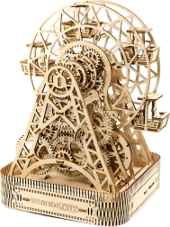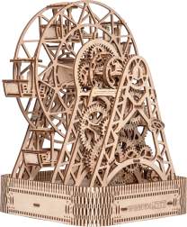 Met één opwinding draait het wiel een minuut lang, waarbij in elk van de zes gondels plaats is voor passagiers. De prachtig uitgesneden standaard en mechanische onderdelen brengen herinneringen aan de legendarische uitvinding van George Ferris tot leven. De set is gemaakt van kwaliteits berkenmultiplex en vereist geen lijm of gereedschap.