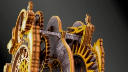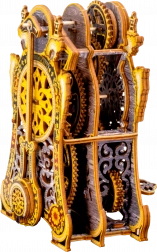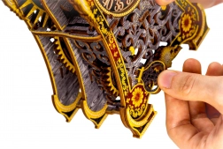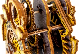 Het model is gemaakt van ecologische berkenmultiplex en wordt zonder lijm of gereedschap in elkaar gezet. Tijdens het bouwen leer je de principes van overbrengingen, elastiekmotoren en de werking van een klokmechanisme van heel dichtbij kennen.