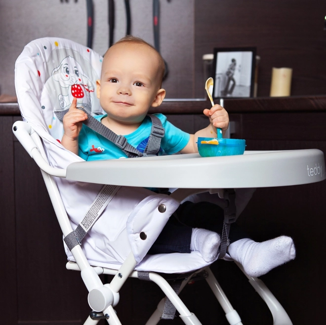 CHIPOLINO Teddy is een praktische kinderstoel die een stabiel metalen frame combineert met licht, soepel gebruik. Dankzij de compacte vouwstand bespaar je ruimte en de kleurrijke details met beertjesmotief maken elke maaltijd leuker.