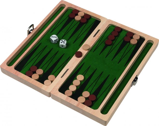 Geniet van het klassieke strategiespel met een elegante set backgammon in een opvouwbaar houten kistje met groen vilt. De complete set met speelschijven en dobbelstenen is ideaal voor gezinsplezier thuis en onderweg.