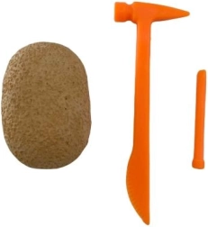 blok met “fossiel”, skeletdelen van een dinosaurus, gereedschap (gebruikelijk: beiteltje, kwastje)