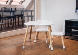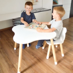 Deze moderne houten set in een tijdloze combinatie van wit en natuurlijk hout past prachtig in elke kinderkamer of speelruimte. De ronde lijnen en het speelse uiterlijk met berenoortjes prikkelen de fantasie, terwijl de robuuste materialen zorgen voor een lange levensduur en eenvoudig schoonmaken.