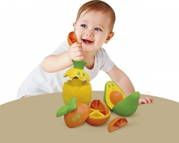 Een leuke set van drie kleurrijke vruchten voor de allerkleinsten die logica, fijne motoriek en bewegingscoördinatie ontwikkelt. De avocado gaat open en verbergt een balletje, de ananas bestaat uit stapelbare onderdelen en de sinaasappel bevat 4 partjes om in te passen. Het speelgoed is gemaakt van meer dan 80% gerecycled plastic, van niet-giftige materialen en is na gebruik 100% recyclebaar.