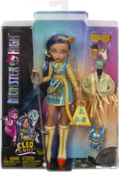 De Cleo De Nile pop uit de Monster High collectie schittert in een iconische outfit geïnspireerd op het oude Egypte: blauw‑gouden jurk met mouwen die aan verbanden doen denken, aangevuld met een kettingriem en kniehoge laarzen. De look wordt geaccentueerd door gouden sieraden en stijlvolle zonnebril.