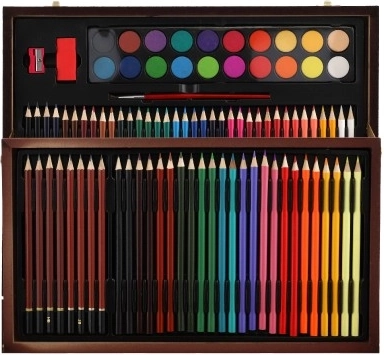 Ontdek de complete kunstset, ideaal voor kleine en grote kunstenaars. Deze praktische set in een elegante houten koffer biedt alles wat nodig is voor schilderen en tekenen, inclusief kleurpotloden, puntenslijper, gum en aquarelverf, in totaal 91 stuks.