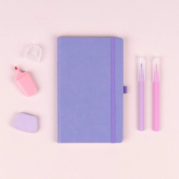 Elegant notitieboek in het formaat 13 × 21 cm, met een duurzame harde kaft en modern lila design. Dankzij de praktische accessoires – elastische band, pennlus en textiele bladwijzer – heb je alles wat belangrijk is altijd bij de hand en blijven je notities overzichtelijk geordend.
