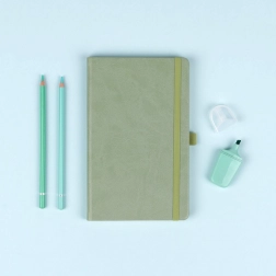 Elegant gelijnd notitieboek in trendy groen met harde kaft, ideaal voor werk en studie. Biedt hoogwaardig geel papier met 6 mm lijnen, een elastische sluitband voor veilig sluiten, een pennenlus en een lintbladwijzer. Het oppervlak met fijne structuur maakt foliedruk van een bedrijfslogo mogelijk, waardoor het ook perfect is als representatieve zakelijke geschenkartikel.