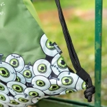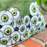 De rugzak is bedekt met een print van groene getekende ogen en de tekst 'Zombie', wat de aandacht trekt en extra karakter geeft.