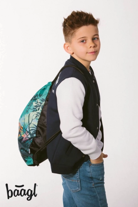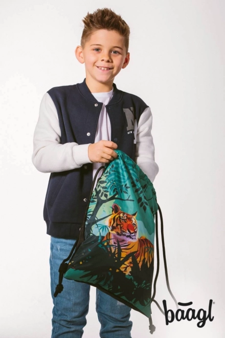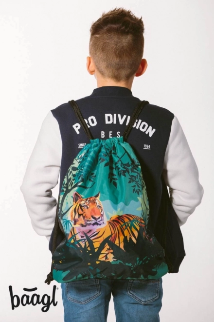 Praktische sportzak van het merk BAAGL met een dynamisch tijgermotief, ideaal voor schoenen en kleine spullen. Biedt een stevig, afwasbaar materiaal en sluiting met sterke koorden, die tegelijk zorgen voor comfortabel dragen op de rug.