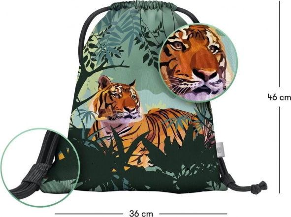 Het koordtreksysteem zorgt voor snel openen en sluiten en dient tegelijk als schouderbanden voor dragen op de rug. De minimalistische snit bespaart ruimte in de rugzak en het tijgermotief geeft je outfit een opvallende stijl.