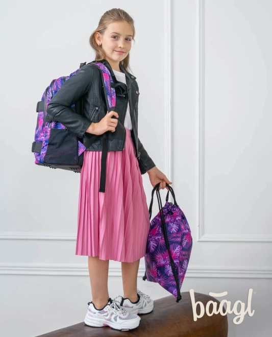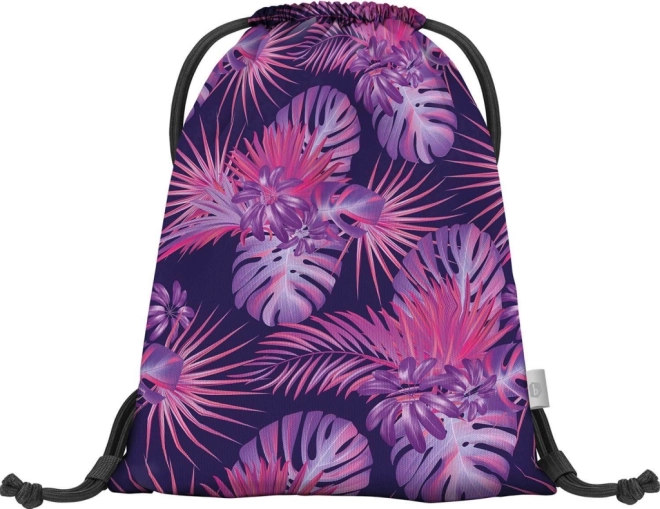 De gymsack heeft een aantrekkelijk tropisch motief in roze en paarse tinten dat de aandacht trekt.