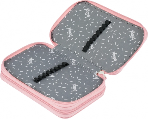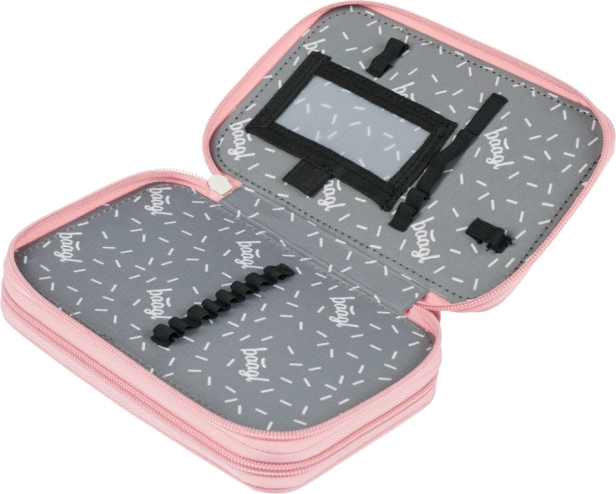 De etui biedt een tweelaags systeem voor optimale organisatie van schoolspullen.